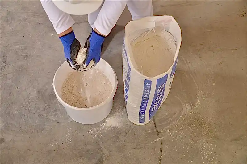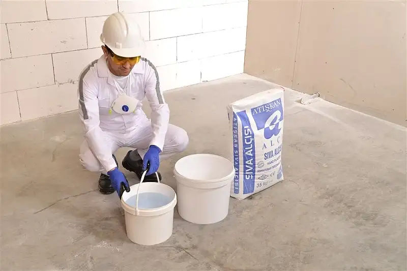 Temiz bir kaba hazırlanacak karışım miktarına uygun taze su alınır; üzerine su yüzeyini örtecek şekilde yaklaşık 6lt suya 10kg Atışkan Sıva Alçısı sepelenir.