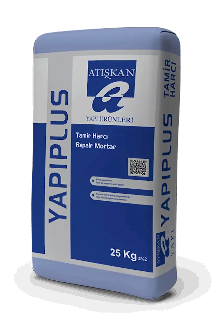 5,5-6,5 lt su ile 25kg.’lık Atışkan yapıplus tamir harcı, düşük devirli bir mikser veya mala ile homojen bir karışım elde edinceye kadar karıştırılır. Harç, 5 dakika dinlendirilir. Uygulama öncesinde tekrar karıştırılır.